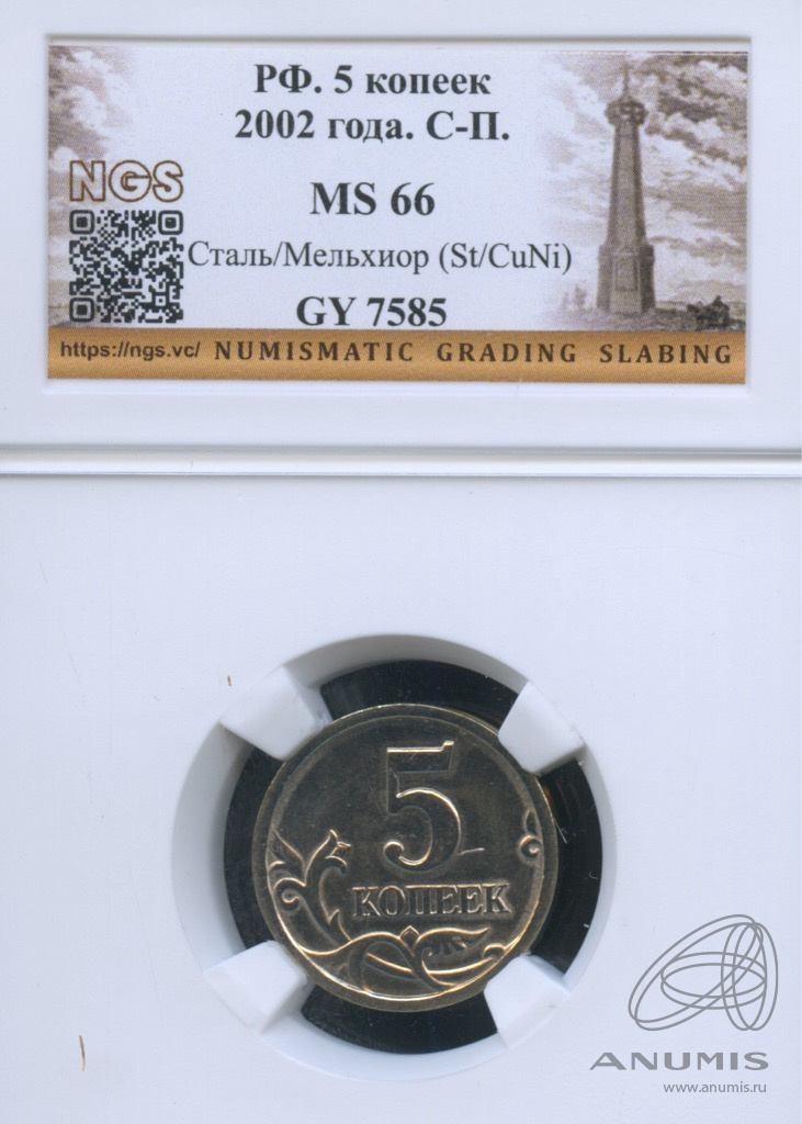 5 копеек образца 1997 годаСерия: Регулярные монеты Аверс— в центре — рельефное изображение Георгия Победоносца верхом на коне, поражающего копьем змея;— справа внизу, под передним копытом коня — буквы: М (Москва) или С-П (Санкт-Петербург), обозначающие монетный двор-изготовитель; — вверху по окружности слева направо — надпись, разделенная фигурой Георгия Победоносца: «БАНК РОССИИ»; — внизу, под изображением змея — год чеканки. Реверс— в центре (ближе к правому краю) — обозначение номинала монеты: цифра 5, под ней — слово «КОПЕЕК», расположенное горизонтально;— в нижней части диска — стилизованный растительный орнамент в виде двух ветвей. АвторыМонетный двор: Санкт-Петербургский монетный двор (С-П) и Московский монетный двор (М) Спецификации