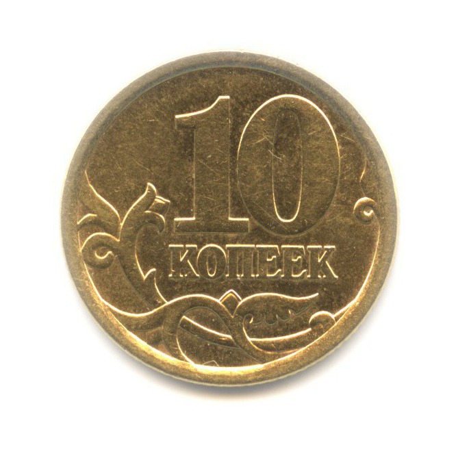 10 копеек образца 1997 годаСерия: Регулярные монеты Начиная со второй половины 2006 года монета Банка России номиналом 10 копеек изготавливается из стали, плакированной с обеих сторон сплавом меди желтого цвета (томпак). Монета обладает ферромагнитными свойствами. Графическое оформление, цвет и размеры монеты сохранены без изменений. С 2015 года монета Банка России номиналом 10 копеек изготавливается как из плакированной сплавом томпак стали, так и из стали с латунным гальваническим покрытием. Графическое оформление и массогабаритные параметры монеты из стали с латунным гальваническим покрытием сохранены без изменений. Монета обладает ферромагнитными свойствами. Монета, изготавливавшаяся ранее из латуни, продолжает оставаться законным средством наличного платежа на территории Российской Федерации. Аверс— в центре — рельефное изображение Георгия Победоносца верхом на коне, поражающего копьем змея;— справа внизу, под передним копытом коня — буквы: М (Москва) или С-П (Санкт-Петербург), обозначающие монетный двор-изготовитель; — вверху по окружности слева направо — надпись, разделенная фигурой Георгия Победоносца: «БАНК РОССИИ»; — внизу, под изображением змея — год чеканки. Реверс— в центре (ближе к правому краю) — обозначение номинала монеты: цифра 10, под ней — слово «КОПЕЕК», расположенное горизонтально;— в нижней части диска — стилизованный растительный орнамент в виде двух ветвей. АвторыМонетный двор: Санкт-Петербургский монетный двор (С-П) и Московский монетный двор (М) Спецификации