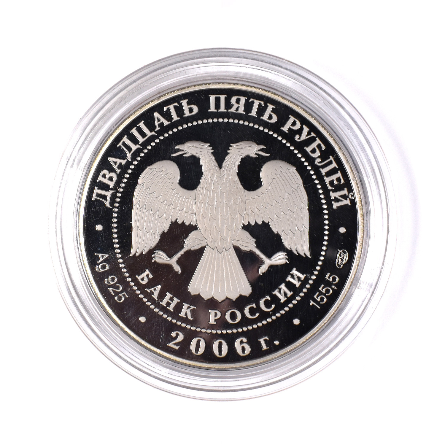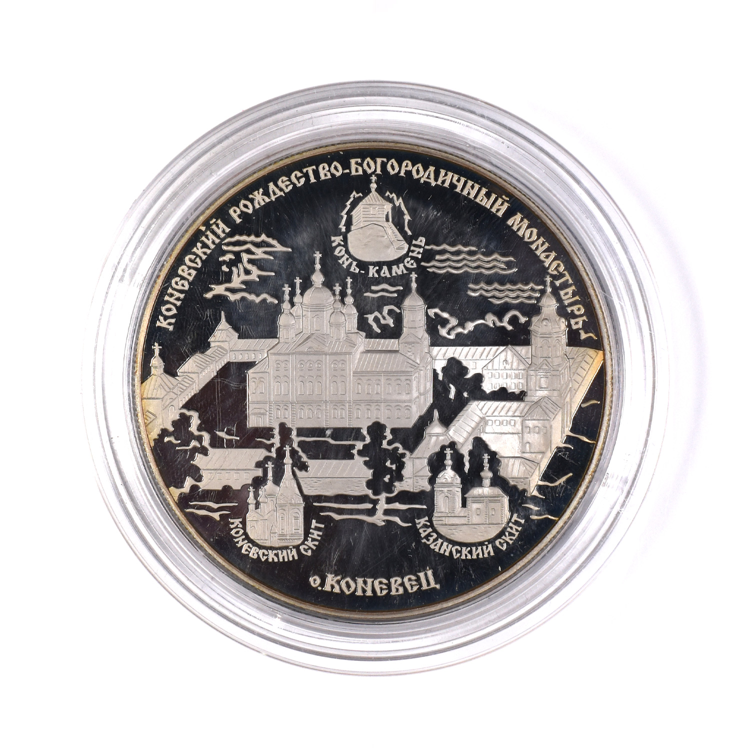 Динамика цен по монете 25 рублей 2006 СПМД „Коневский Рождество-Богородичный монастырь“ PROOFКоневский Рождество-Богородичный монастырьСерия: Памятники архитектуры России Аверсв центре диска — эмблема Банка России (двуглавый орел с опущенными крыльями, под ним надпись полукругом «БАНК РОССИИ»), обрамленная кругом из точек и надписями по кругу: вверху — «ДВАДЦАТЬ ПЯТЬ РУБЛЕЙ», внизу — «2006 г.», слева — обозначение металла, проба сплава, справа — содержание драгоценного металла в чистоте и товарный знак монетного двора.Реверсна фоне стилизованного изображения острова в центре панорамы памятников Коневского Рождество-Богородичного монастыря — собор Рождества Пресвятой Богородицы, внизу слева — ансамбль Святогорского Коневского скита с надписью полукругом: «КОНЕВСКИЙ СКИТ», справа — церковь и колокольня с надписью полукругом: «КАЗАНСКИЙ СКИТ», вверху — изображение часовни на валуне с надписью полукругом «КОНЬ-КАМЕНЬ», по окружности — надписи: вверху — «КОНЕВСКИЙ РОЖДЕСТВО-БОГОРОДИЧНЫЙ МОНАСТЫРЬ», внизу — «о. КОНЕВЕЦ».Каталожные номера