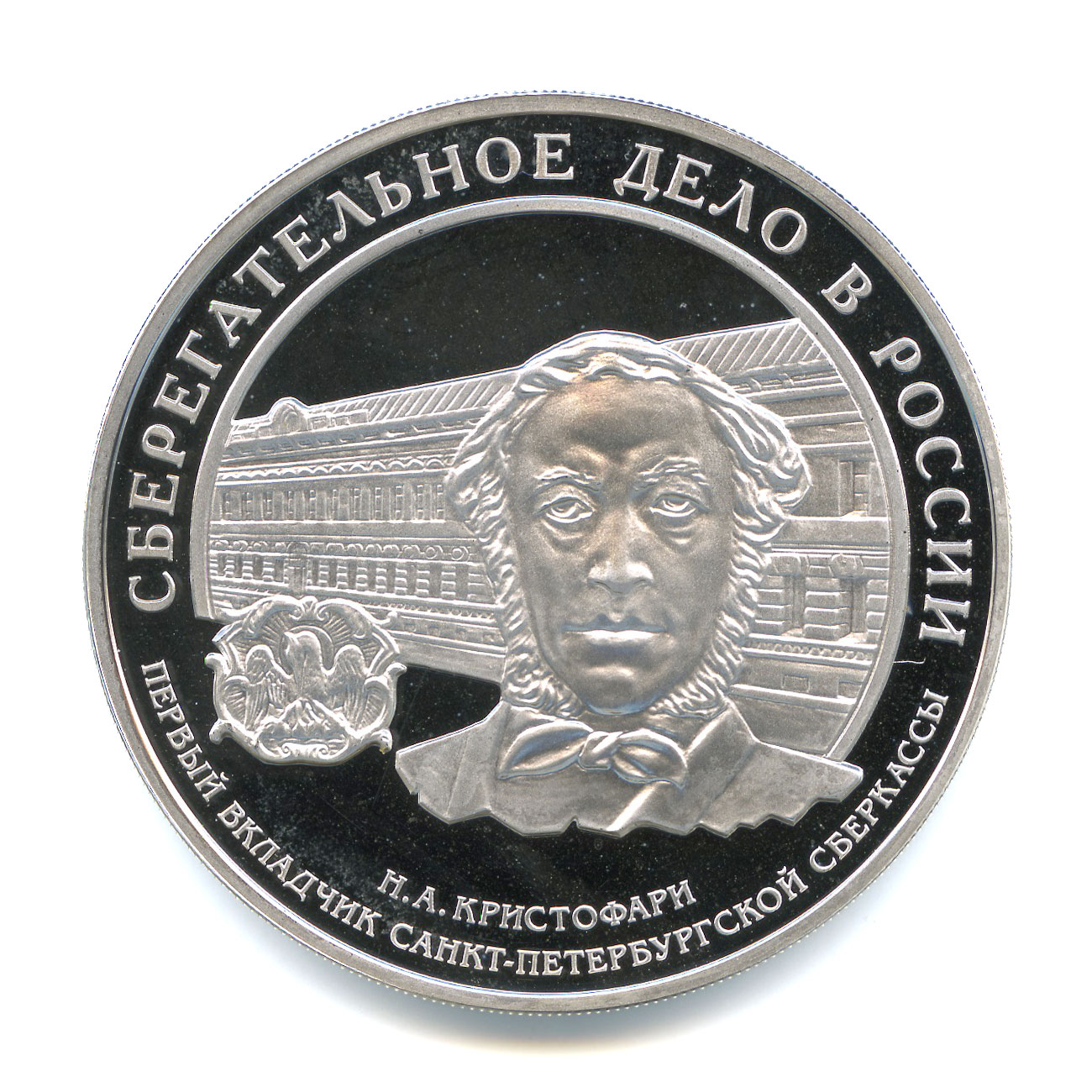 Динамика цен по монете 3 рубля 2006 ММД „160 лет сберегательному делу России“ PROOFCберегательное дело в РоссииДата выпуска: 03.11.2006 Аверсв центре диска — эмблема Банка России (двуглавый орел с опущенными крыльями, под ним надпись полукругом «БАНК РОССИИ»), обрамленная кругом из точек и надписями по кругу: вверху — «ТРИ РУБЛЯ», внизу — «2006 г.», слева — обозначение металла, проба сплава, справа — содержание драгоценного металла в чистоте и товарный знак монетного двора.Реверсв центре — портрет первого вкладчика Санкт-Петербургской сберкассы, слева от него — герб Воспитательного дома, на втором плане — здание Опекунского совета, по окружности — надписи: вверху — «СБЕРЕГАТЕЛЬНОЕ ДЕЛО В РОССИИ», внизу в две строки — «Н.А. КРИСТОФАРИ» «ПЕРВЫЙ ВКЛАДЧИК САНКТ-ПЕТЕРБУРГСКОЙ СБЕРКАССЫ».Каталожные номера