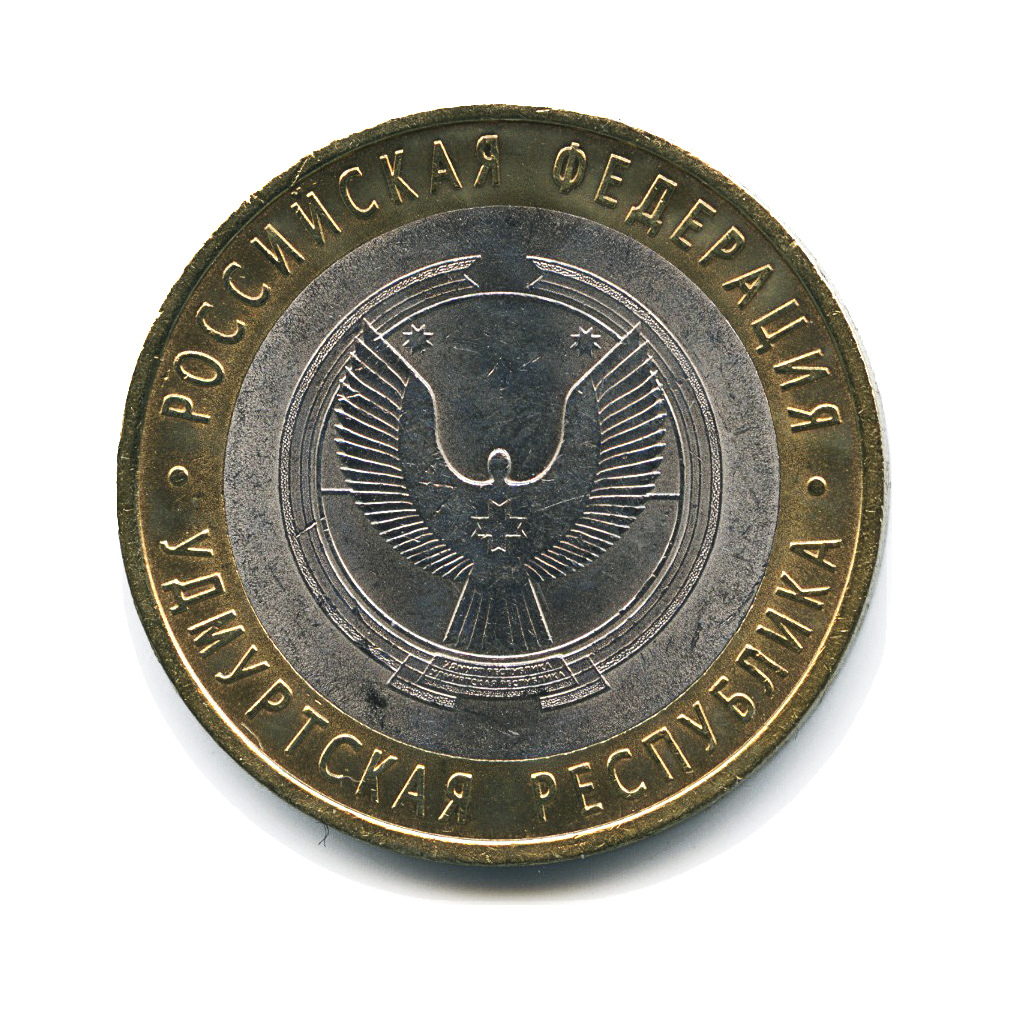 Динамика цен по монете 10 рублей 2008 СПМД „Удмуртская республика“ MSУдмуртская РеспубликаСерия: Российская Федерация Об удмуртах, коренном населении Удмуртии, первая информация появляется в летописях XII века. Местных жителей Прикамья называли по-разному — аряны, ары, вотяки и отяки. Современная история региона начинается в 1920 году, когда была образована Вотская АО. Удмуртская Республика сегодня — крупный промышленный регион, где ведется добыча полезных ископаемых (уголь, нефть, газ). Кроме того, здесь много производственных предприятий, специализирующихся на обработке металлов и машиностроении. Аверсв центре диска — обозначение достоинства монеты «10 РУБЛЕЙ». Внутри цифры «0» — скрытые, видимые поочередно при изменении угла зрения изображения цифры «10» и надписи «РУБ». В нижней части диска — товарный знак монетного двора. В верхней части кольца по окружности — надпись: «БАНК РОССИИ», в нижней — дата «2008», слева и справа — стилизованные ветви растений, переходящие на диск.Реверсизображение герба Удмуртской Республики, по окружности — надписи: вверху — «РОССИЙСКАЯ ФЕДЕРАЦИЯ», внизу — «УДМУРТСКАЯ РЕСПУБЛИКА».Каталожные номера