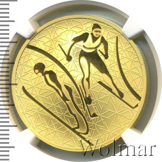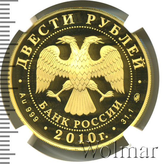 Лыжное двоеборьеСерия: Зимние виды спорта Аверсв центре — эмблема Банка России (двуглавый орёл с опущенными крыльями, под ним — надпись полукругом «БАНК РОССИИ»), обрамленная кругом из точек и надписями по кругу — вверху: «ДВЕСТИ РУБЛЕЙ», внизу: слева — обозначения драгоценного металла и пробы сплава, в центре — дата выпуска «2010 г.», справа — содержание химически чистого металла и товарный знак монетного двора.Реверсна матовой поверхности диска — изображение двух спортсменов — бегущего по трассе и прыгающего с трамплина на фоне стилизованного изображения снежинок.Каталожные номера