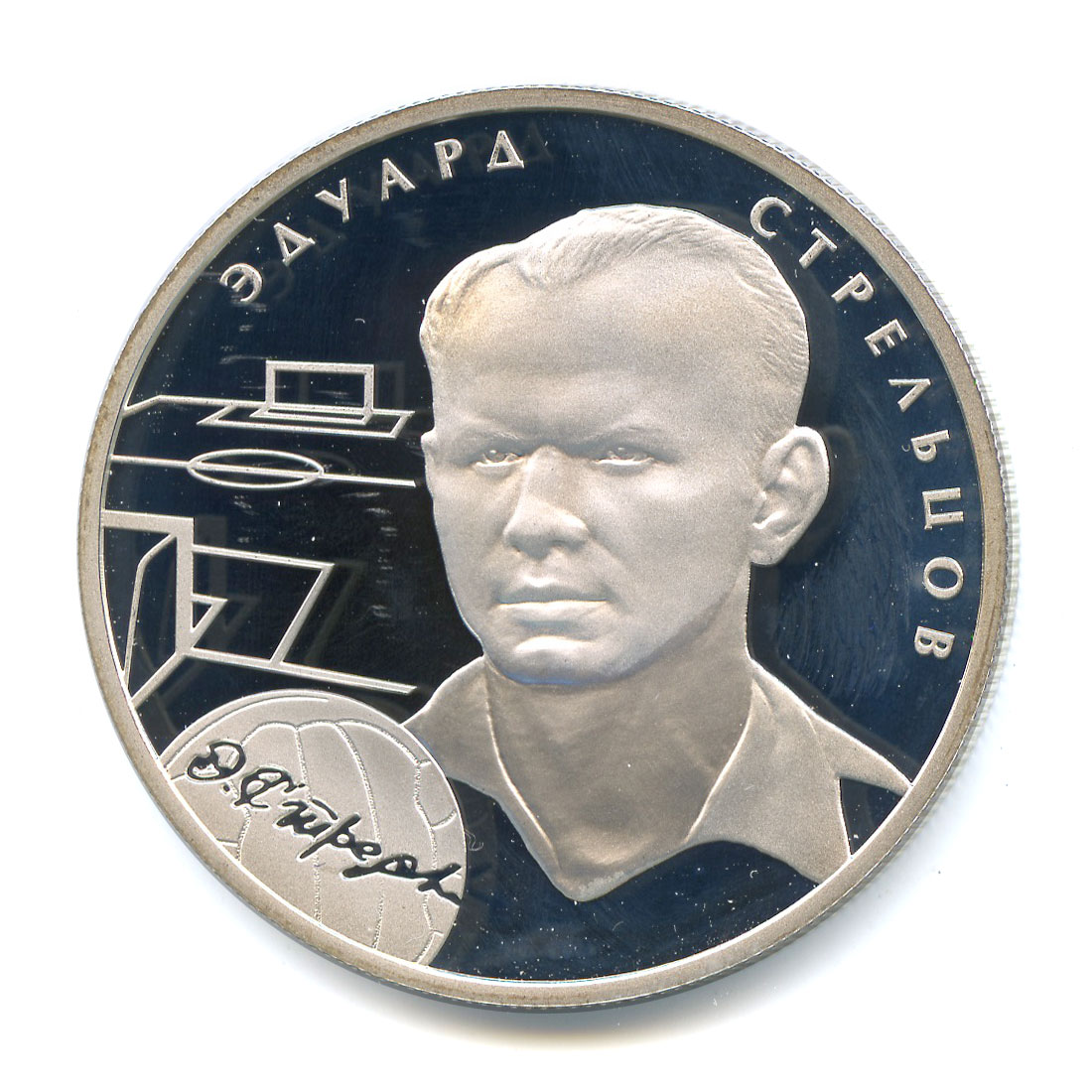 Динамика цен по монете 2 рубля 2010 ММД „Футбол Э.А. Стрельцов“ PROOFЭ.А. СтрельцовСерия: Выдающиеся спортсмены России (футбол) Аверсв центре — эмблема Банка России (двуглавый орёл с опущенными крыльями, под ним — надпись полукругом «БАНК РОССИИ»), обрамленная кругом из точек и надписями по кругу — вверху: «ДВА РУБЛЯ», внизу: слева — обозначения драгоценного металла и пробы сплава, в центре — дата выпуска «2010 г.», справа — содержание химически чистого металла и товарный знак монетного двора.Реверсслева — стилизованное изображение футбольного поля, справа — портрет Э.А. Стрельцова, внизу — футбольный мяч с его факсимильной подписью, вверху по окружности — надпись: «ЭДУАРД СТРЕЛЬЦОВ».Каталожные номера