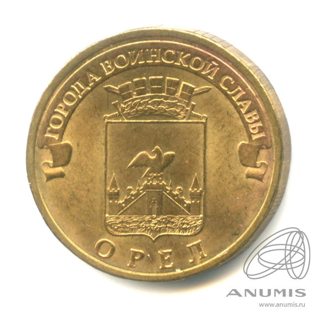 Динамика цен по монете 10 рублей 2011 СПМД „Орел“ MSОрёлСерия: Города воинской славы Город Орёл — административный центр Орловской области, расположен в 368 км. к юго-западу от Москвы в месте слияния Оки с ее притоком Орликом, который до 1784 года носил название Орёл. Город основан по указу Ивана Грозного в 1566 году как город- крепость для защиты южных рубежей Московского государства от набегов Крымских татар. В 1708 году Орёл был причислен к Киевской губернии, с 1719 года являлся центром Орловской провинции, с 1778 года — центром Орловского наместничества, в с 1796 по 1928 г. являлся центром Орловской губернии. В 1920-х, 1930-х годах Орел входил в состав Центрально-Чернозёмной и Курской областей, а с 1937 года стал центром вновь образованной Орловской области. Современный Орёл — крупный промышленный и культурный центр. В экономике города преобладают легкая и пищевая промышленность (28,8%), машин и электрооборудования (27,3%), неметаллических минеральных продуктов (19,9%), металлургическое производство и производство готовых металлических изделий (18,0%). В городе 15 высших и средних учебных заведений, среди которых три университета, академия и три института, действуют четыре театра и более десятка музеев. Орёл является крупным транспортным узлом на стыке Центрального и Центрально-Чернозёмного экономических районов, здесь сходятся 7 автомобильных магистралей федерального и республиканского значений и 5 железнодорожных линий. Население города в 2010 году составило 317,9 тыс. человек. В годы Великой Отечественной войны Орел оказался на одном из важнейших направлений боевых действий. В июле-августе 1943 года на Курско-Орловском участке фронта, получившим название Курской дуги, развернулось одно из самых крупных сражений Второй мировой войны, в котором было задействовано c обоих сторон 4 миллиона солдат, 69 тыс. орудий, 13, 2 тыс. танков и самоходных артиллерийских установок, 12 тыс. боевых самолетов. В ходе 45-дневных напряженных боев советские войска разгромили 30 дивизий противника и отбросили его на 140 км. Советская армия разгромила 30 дивизий противника, в том числе 7 танковых, уничтожила 1,5 тыс. танков, 3 тыс. орудий и 3,5 тыс. боевых самолетов. Курская битва явилась важным переломным моментом в ходе войны, в результате которой Советская армия перехватила стратегическую инициативу и стала наращивать наступление на Запад. 5 августа 1943 года в Москве был дан первый артиллерийский салют войскам, освободившим Орёл и Белгород. 27 апреля 2007 года Указом президента Российской Федерации город Орёл был удостоен почетного звания «Города воинской славы». Источник: информационный ресурс ru. wikipedia Аверсв центре диска — обозначение номинала монеты «10 РУБЛЕЙ». Внутри цифры «0» — скрытые, видимые поочередно при изменении угла зрения изображения цифры «10» и надписи «РУБ». По окружности вдоль канта — надписи, вверху: «БАНК РОССИИ», внизу — дата: «2011», слева — стилизованное изображение лавровой ветви, справа — дубовой.Реверсгерб города Орла, над ним, на ленте — надпись полукругом: «ГОРОДА ВОИНСКОЙ СЛАВЫ», внизу, вдоль канта — надпись: «ОРЁЛ»Каталожные номера