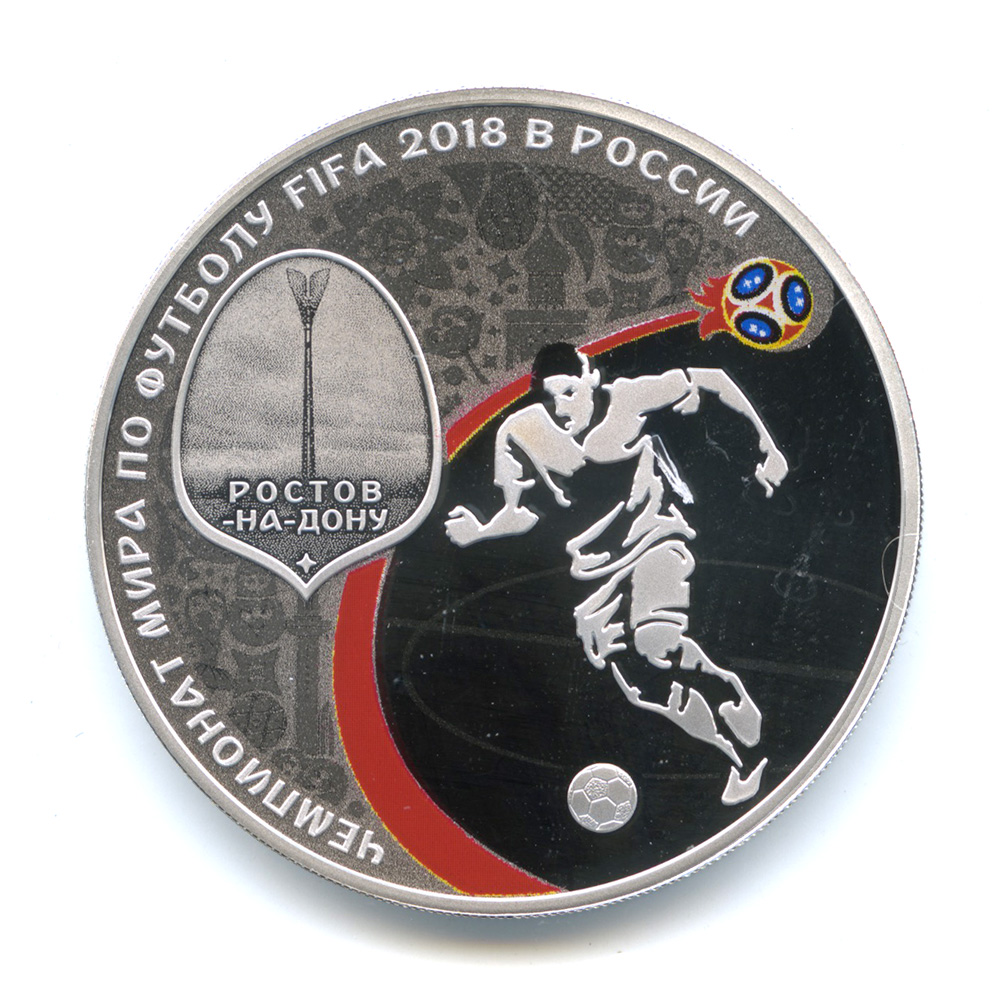 Динамика цен по монете 3 рубля 2018 СПМД „Ростов-на-Дону“ PROOFРостов-на-Дону. Чемпионат мира по футболу FIFA 2018 в РоссииСерия: Чемпионат мира по футболу FIFA 2018 в России Аверсна зеркальном поле диска — рельефное изображение Государственного герба Российской Федерации, над ним вдоль канта — надпись полукругом: «РОССИЙСКАЯ ФЕДЕРАЦИЯ», обрамленная с обеих сторон сдвоенными ромбами, внизу под гербом: слева — обозначения драгоценного металла и пробы сплава, справа — содержание химически чистого металла и товарный знак монетного двора, внизу в центре в три строки — надпись: «БАНК РОССИИ», номинал монеты: «3 РУБЛЯ», год: «2018 г.».Реверсизображения картуша с мемориальной стелой и надписью в две строки «РОСТОВ-НА-ДОНУ» на фоне орнамента, состоящего из элементов, отображающих российскую культуру и фольклорное наследие, а также футбольный мир; выполненной в цвете траектории полета стилизованного мяча, футболиста; по окружности — надпись: «ЧЕМПИОНАТ МИРА ПО ФУТБОЛУ FIFA 2018 В РОССИИ».Каталожные номера