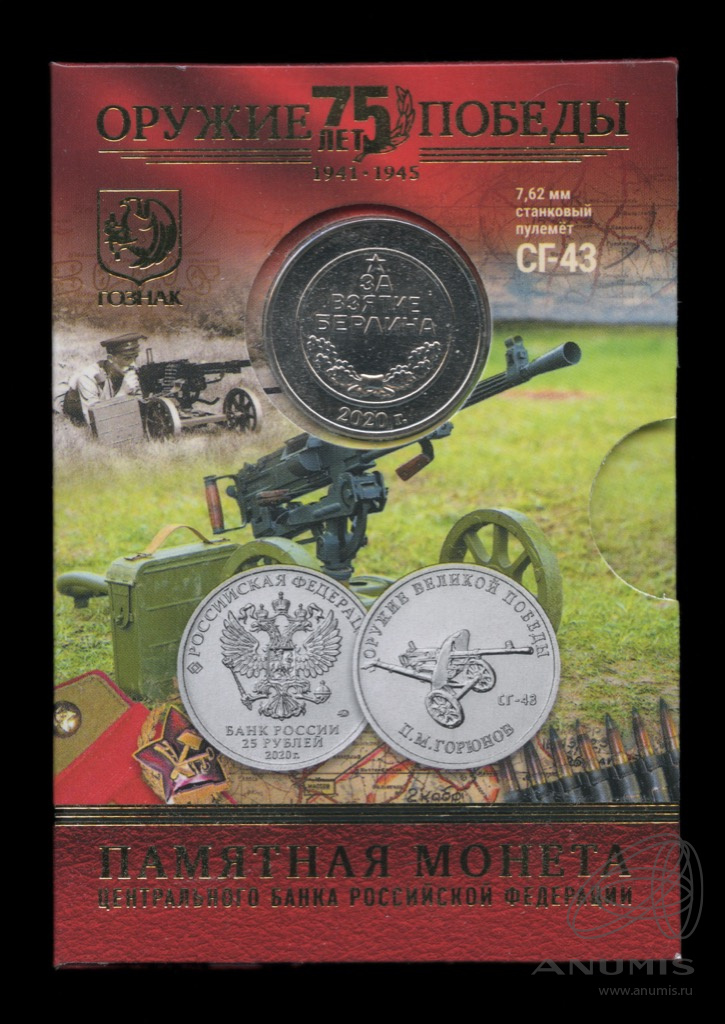 Конструктор оружия П.М. ГорюновСерия: Оружие Великой Победы (конструкторы оружия) Петр Максимович Горюнов (1902−1943) — советский конструктор стрелкового оружия, разработавший «7,62-мм станковый пулемет системы Горюнова образца 1943 года» (СГ-43), принятый на вооружение в 1943 году. С началом Великой Отечественной войны остро встал вопрос о разработке станкового пулемета облегченного типа в дополнение к надежному и мощному, но слишком тяжелому пулемету Максима. По результатам конкурсных испытаний лучшим был признан пулемет П.М. Горюнова СГ-43. СГ-43 обошел своих конкурентов, в том числе пулемет ДС-43, созданный ведущим советским конструктором стрелкового оружия В.А. Дегтяревым, в таких показателях, как простота конструкции, кучность стрельбы, живучесть деталей и безотказность работы. СГ-43 был принят на вооружение с колесным станком Дегтярева и благодаря значительно упрощенной технологии изготовления быстро запущен в серийное производство. Значительно меньший, чем у пулемета Максима, вес при почти равной кучности стрельбы обеспечили пулемету Горюнова успех в наступательных операциях советских войск на заключительном этапе войны. Аверсв центре — рельефное изображение Государственного герба Российской Федерации, над ним вдоль канта — надпись полукругом: «РОССИЙСКАЯ ФЕДЕРАЦИЯ», обрамленная с обеих сторон сдвоенными ромбами, под гербом в центре в три строки — надпись: «БАНК РОССИИ», номинал монеты: «25 РУБЛЕЙ», год выпуска:«2020 г.», справа — товарный знак монетного двора. Реверсрельефное изображение станкового пулемета СГ-43, справа — надпись: «СГ-43»; вдоль канта — надписи, вверху: «ОРУЖИЕ ВЕЛИКОЙ ПОБЕДЫ», внизу: «П.М. ГОРЮНОВ».Каталожные номера