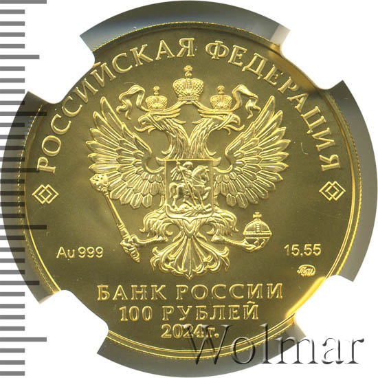 Георгий ПобедоносецДата выпуска: 07.10.2024 Издревле на Руси и в соседних с ней государствах изображение Георгия Победоносца использовалось в качестве элементов государственной символики — на княжеских печатях, штандартах, гербах, монетах. Его изображение было элементом государственного герба Российской империи, присутствует оно и на государственном гербе Российской Федерации. Аверсрельефное изображение Государственного герба Российской Федерации, над ним вдоль канта — надпись полукругом «РОССИЙСКАЯ ФЕДЕРАЦИЯ», обрамленная с обеих сторон сдвоенными ромбами, под гербом слева — обозначения драгоценного металла и пробы, справа — содержание химически чистого металла и товарный знак монетного двора, внизу в центре в три строки — надпись «БАНК РОССИИ», номинал монеты «100 РУБЛЕЙ», год выпуска «2024 г.».Реверсрельефное изображение Георгия Победоносца на коне, поражающего копьем змея.Каталожные номера
