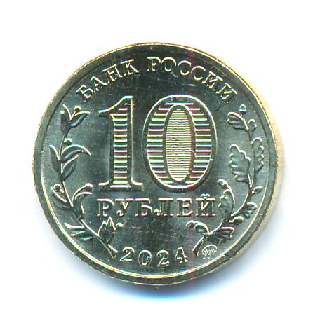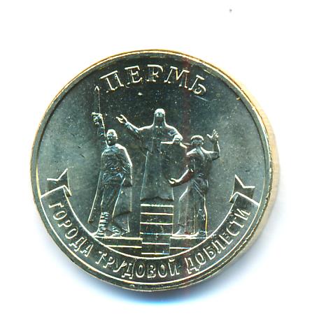 ПермьСерия: Города трудовой доблести За значительный вклад жителей города в достижение Победы в Великой Отечественной войне 1941−1945 годов, обеспечение бесперебойного производства военной и гражданской продукции на промышленных предприятиях, проявленные при этом массовый трудовой героизм и самоотверженность г. Перми присвоено почетное звание Российской Федерации «Город трудовой доблести». В тылу трудились около 100 тысяч пермяков. Жители Перми обеспечили бесперебойное производство на предприятиях военной и гражданской продукции. В Перми произвели и отправили на фронт более 13 млн минометных снарядов, около 3 млн реактивных зарядов для «Катюш», более 10 млн пар сапог и касок, 650 тысяч телефонных аппаратов. Каждый третий артиллерийский снаряд был укомплектован пермским взрывателем. Все боевые самолеты, построенные в годы войны, были обеспечены пермской топливной аппаратурой. Две трети из всех ракетных зарядов, изготовленных за годы войны пороховой промышленностью страны, было произведено в Перми. Всего в годы Великой Отечественной войны 11 орденами было награждено 9 предприятий, 6 предприятий получили Красные знамена на вечное хранение. В годы Великой Отечественной войны в Перми разместилось значительное количество эвакуированных предприятий, учреждений культуры и образования из Ленинграда. Источники: www.gorodperm.ru, Указ Президента РФ от 2 июля 2020 г. № 444 «О присвоении почетного звания Российской Федерации «Город трудовой доблести». Аверсобозначение номинала монеты «10 РУБЛЕЙ», внутри цифры «0» — скрытые, видимые поочередно при изменении угла зрения изображения числа «10» и надписи «РУБ», cлева и справа — стилизованные изображения ветви лавра и дуба соответственно, вдоль канта вверху — надпись «БАНК РОССИИ»,внизу — год выпуска «2024», справа от него — товарный знак монетного двора. Реверсрельефное изображение монумента «Героям фронта и тыла»; по окружности — надписи, вверху: «ПЕРМЬ», внизу, на ленте: «ГОРОДА ТРУДОВОЙ ДОБЛЕСТИ».Каталожные номера