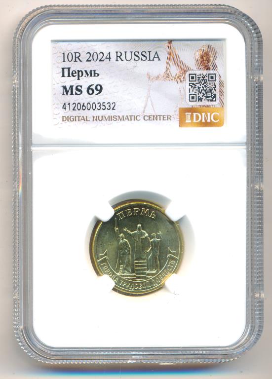 ПермьСерия: Города трудовой доблести За значительный вклад жителей города в достижение Победы в Великой Отечественной войне 1941−1945 годов, обеспечение бесперебойного производства военной и гражданской продукции на промышленных предприятиях, проявленные при этом массовый трудовой героизм и самоотверженность г. Перми присвоено почетное звание Российской Федерации «Город трудовой доблести». В тылу трудились около 100 тысяч пермяков. Жители Перми обеспечили бесперебойное производство на предприятиях военной и гражданской продукции. В Перми произвели и отправили на фронт более 13 млн минометных снарядов, около 3 млн реактивных зарядов для «Катюш», более 10 млн пар сапог и касок, 650 тысяч телефонных аппаратов. Каждый третий артиллерийский снаряд был укомплектован пермским взрывателем. Все боевые самолеты, построенные в годы войны, были обеспечены пермской топливной аппаратурой. Две трети из всех ракетных зарядов, изготовленных за годы войны пороховой промышленностью страны, было произведено в Перми. Всего в годы Великой Отечественной войны 11 орденами было награждено 9 предприятий, 6 предприятий получили Красные знамена на вечное хранение. В годы Великой Отечественной войны в Перми разместилось значительное количество эвакуированных предприятий, учреждений культуры и образования из Ленинграда. Источники: www.gorodperm.ru, Указ Президента РФ от 2 июля 2020 г. № 444 «О присвоении почетного звания Российской Федерации «Город трудовой доблести». Аверсобозначение номинала монеты «10 РУБЛЕЙ», внутри цифры «0» — скрытые, видимые поочередно при изменении угла зрения изображения числа «10» и надписи «РУБ», cлева и справа — стилизованные изображения ветви лавра и дуба соответственно, вдоль канта вверху — надпись «БАНК РОССИИ»,внизу — год выпуска «2024», справа от него — товарный знак монетного двора. Реверсрельефное изображение монумента «Героям фронта и тыла»; по окружности — надписи, вверху: «ПЕРМЬ», внизу, на ленте: «ГОРОДА ТРУДОВОЙ ДОБЛЕСТИ».Каталожные номера