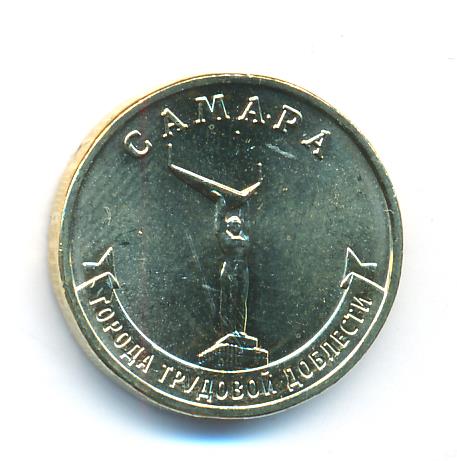 СамараСерия: Города трудовой доблести За значительный вклад жителей города в достижение Победы в Великой Отечественной войне 1941−1945 годов, обеспечение бесперебойного производства военной и гражданской продукции на промышленных предприятиях, проявленные при этом массовый трудовой героизм и самоотверженность г. Самаре присвоено почетное звание Российской Федерации «Город трудовой доблести». Самара, в прошлом — Куйбышев, внесла огромный вклад в Великую Победу. В годы Великой Отечественной войны именно Куйбышев стал «запасной столицей»: сюда были эвакуированы Правительство, Верховный Совет СССР, многие наркоматы, весь дипломатический корпус, Большой театр СССР, Симфонический оркестр Всесоюзного радио, Ленинградский драматический театр и многие другие учреждения. Небольшой до войны город с населением в 390 000 человек принял огромное количество эвакуированных: в сентябре 1941 года в нем проживало уже около 700 000 человек. Кроме того, в Куйбышевскую область было эвакуировано около 1500 организаций, в том числе 60 крупных промышленных предприятий. Вскоре после начала войны в Куйбышеве завершилось строительство крупнейшего в стране авиакомплекса на базе эвакуированных из западных районов СССР авиационных заводов. В годы войны в городе работало порядка 20 крупных промышленных предприятий, ковавших оружие Победы. Так, за годы войны на механическом заводе были произведены 20 000 бронекорпусов для Ил-2 и 4000 бронекорпусов для Ил-10. Помимо этого, заводы изготовили около 16 000 различных элементов бронезащиты для самолетов. За время войны в Куйбышеве были изготовлены более 36 тысяч боевых самолетов, каждая пятая авиабомба, каждый третий артиллерийский снаряд. Трудовой героизм горожан позволил увеличить выпуск промышленной продукции предприятиями города к 1945 году по сравнению с 1940 годом в 11 раз. За трудовые подвиги многие городские предприятия награждались государственными наградами, им неоднократно вручались переходящие Красные знамена Государственного Комитета Обороны. Источники: www.samregion.ru, Указ Президента РФ от 2 июля 2020 г. № 444 «О присвоении почетного звания Российской Федерации «Город трудовой доблести». Аверсобозначение номинала монеты «10 РУБЛЕЙ», внутри цифры «0» — скрытые, видимые поочередно при изменении угла зрения изображения числа «10» и надписи «РУБ», cлева и справа — стилизованные изображения ветви лавра и дуба соответственно, вдоль канта вверху — надпись «БАНК РОССИИ»,внизу — год выпуска «2024», справа от него — товарный знак монетного двора. Реверсрельефное изображение фрагмента мемориального комплекса «Монумент Славы»; по окружности — надписи, вверху: «САМАРА», внизу, на ленте: «ГОРОДА ТРУДОВОЙ ДОБЛЕСТИ».Каталожные номера