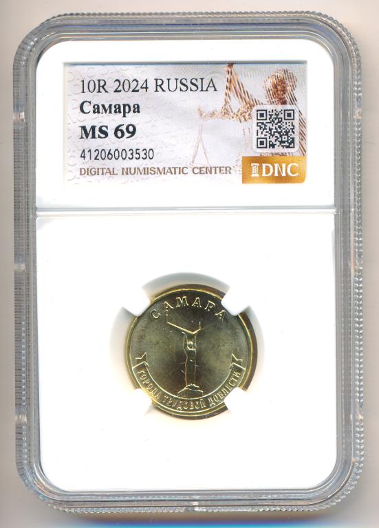 СамараСерия: Города трудовой доблести За значительный вклад жителей города в достижение Победы в Великой Отечественной войне 1941−1945 годов, обеспечение бесперебойного производства военной и гражданской продукции на промышленных предприятиях, проявленные при этом массовый трудовой героизм и самоотверженность г. Самаре присвоено почетное звание Российской Федерации «Город трудовой доблести». Самара, в прошлом — Куйбышев, внесла огромный вклад в Великую Победу. В годы Великой Отечественной войны именно Куйбышев стал «запасной столицей»: сюда были эвакуированы Правительство, Верховный Совет СССР, многие наркоматы, весь дипломатический корпус, Большой театр СССР, Симфонический оркестр Всесоюзного радио, Ленинградский драматический театр и многие другие учреждения. Небольшой до войны город с населением в 390 000 человек принял огромное количество эвакуированных: в сентябре 1941 года в нем проживало уже около 700 000 человек. Кроме того, в Куйбышевскую область было эвакуировано около 1500 организаций, в том числе 60 крупных промышленных предприятий. Вскоре после начала войны в Куйбышеве завершилось строительство крупнейшего в стране авиакомплекса на базе эвакуированных из западных районов СССР авиационных заводов. В годы войны в городе работало порядка 20 крупных промышленных предприятий, ковавших оружие Победы. Так, за годы войны на механическом заводе были произведены 20 000 бронекорпусов для Ил-2 и 4000 бронекорпусов для Ил-10. Помимо этого, заводы изготовили около 16 000 различных элементов бронезащиты для самолетов. За время войны в Куйбышеве были изготовлены более 36 тысяч боевых самолетов, каждая пятая авиабомба, каждый третий артиллерийский снаряд. Трудовой героизм горожан позволил увеличить выпуск промышленной продукции предприятиями города к 1945 году по сравнению с 1940 годом в 11 раз. За трудовые подвиги многие городские предприятия награждались государственными наградами, им неоднократно вручались переходящие Красные знамена Государственного Комитета Обороны. Источники: www.samregion.ru, Указ Президента РФ от 2 июля 2020 г. № 444 «О присвоении почетного звания Российской Федерации «Город трудовой доблести». Аверсобозначение номинала монеты «10 РУБЛЕЙ», внутри цифры «0» — скрытые, видимые поочередно при изменении угла зрения изображения числа «10» и надписи «РУБ», cлева и справа — стилизованные изображения ветви лавра и дуба соответственно, вдоль канта вверху — надпись «БАНК РОССИИ»,внизу — год выпуска «2024», справа от него — товарный знак монетного двора. Реверсрельефное изображение фрагмента мемориального комплекса «Монумент Славы»; по окружности — надписи, вверху: «САМАРА», внизу, на ленте: «ГОРОДА ТРУДОВОЙ ДОБЛЕСТИ».Каталожные номера