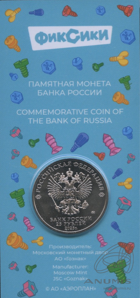 Динамика цен по монете 25 рублей 2025 ММД „Фиксики (цветная)“ MSФиксикиСерия: Российская (советская) мультипликация Анимационный сериал «Фиксики», появившийся в России в 2010 году, рассказывает детям о маленьких человечках, которые живут в приборах, механизмах и других вещах, созданных человеком, и ухаживают за ними. Фиксики в игровой форме рассказывают детям о науке, технике и том, как устроен мир вокруг. С момента выхода сериала его посмотрели по всему миру свыше 25 миллиардов раз. Информация предоставлена ГК «Рики». Аверсрельефное изображение Государственного герба Российской Федерации, над ним вдоль канта — надпись полукругом «РОССИЙСКАЯ ФЕДЕРАЦИЯ», обрамленная с обеих сторон сдвоенными ромбами, под гербом в центре в три строки — надпись «БАНК РОССИИ», номинал монеты «25 РУБЛЕЙ», год выпуска «2025 г.», справа — товарный знак монетного двора.Реверсвыполненное в цвете изображение героев мультсериала «Фиксики», вверху — надпись «ФИКСИКИ».Каталожные номера